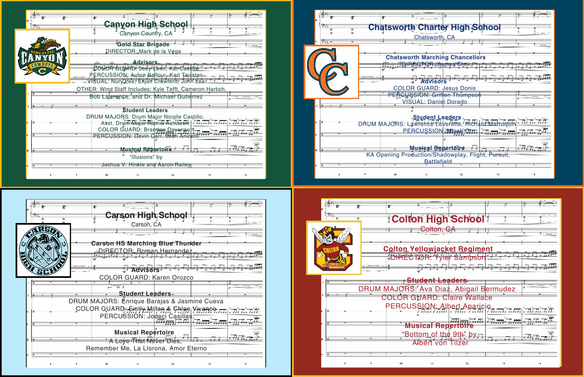 Advisors COLOR GUARD: Joey Leon, Kat Castillo PERCUSSION: Aubre Balfour, Karl Taoatao VISUAL: Nury Lee, Elijah Crawford, John Lee