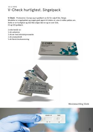 V-Check - Produseres i Europa og er godkjent av EU for salg l bla . Norge . Modellen er singelpakket og meget godt egent l å deles ut , uten å må e pakkes om . De e er en hur gtest og skal ikke selges løst en og en over disk . CE og IVD godkjent .