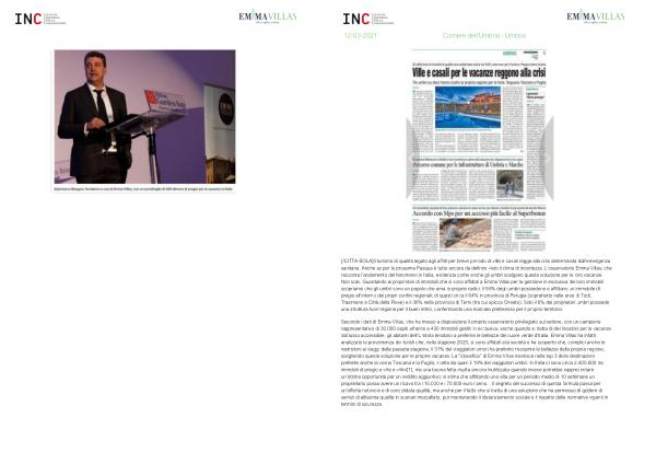 Secondo i dati di Emma Villas , che ha messo a disposizione il proprio osservatorio privilegiato sul settore , con un campione rappresentativo di 30.000 ospiti all ’ anno e 430 immobili gestiti in esclusiva , anche quando si tratta di destinazioni per le vacanze dal lusso accessibile , gli abitanti dell ’ Umbria tendono a preferire le bellezze del cuore verde d ’ Italia . Emma Villas ha infatti analizzato la provenienza dei turisti che , nella stagione 2020 , si sono affidati alla società e ha scoperto che , complici anche le restrizioni ai viaggi della passata stagione , il 31 % dei viaggiatori umbri ha preferito riscoprire le bellezze della propria regione , scegliendo questa soluzione per le proprie vacanze . La “ classifica ” di Emma Villas inserisce nella top 3 delle destinazioni preferite anche la vicina Toscana e la Puglia , scelta da quasi il 19 % dei viaggiatori umbri . In Italia ci sono circa 2.400.000 tra immobili di pregio e ville e villini [ 1 ], ma una buona fetta risulta ancora inutilizzata quando invece potrebbe rappresentare un ’ ottima opportunità per un reddito aggiuntivo : si stima che affittando una villa per un periodo medio di 10 settimane un proprietario possa avere un ricavo tra i 15.000 e i 70.000 euro l ’ anno . . Il segreto del successo di questa formula passa per un ’ offerta notevole e di consolidata qualità , ma anche per il fatto che si tratta di una soluzione che ha permesso di godere di servizi di altissima qualità in scenari mozzafiato , pur mantenendo il distanziamento sociale e il rispetto delle normative vigenti in termini di sicurezza .