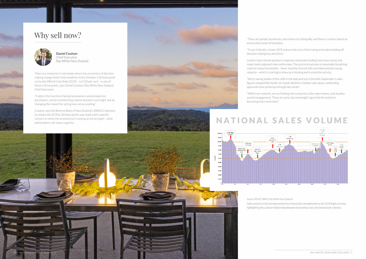 Source: REINZ, RBNZ, Ray White New Zealand Sales activity in the housing market has historically strengthened as the OCR begins to ease, highlighting the cyclical relationship between borrowing costs and transaction volumes.