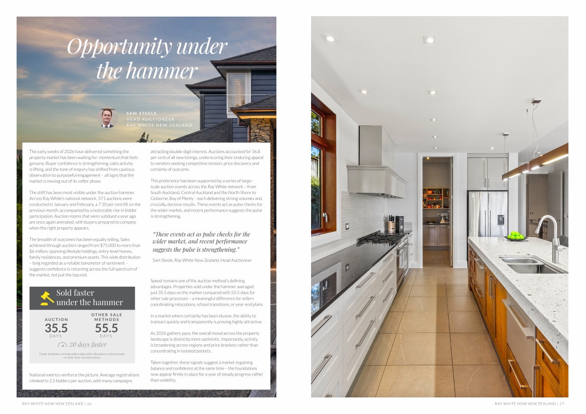 This preference has been supported by a series of largescale auction events across the Ray White network – from South Auckland, Central Auckland and the North Shore to Gisborne, Bay of Plenty – each delivering strong volumes and, crucially, decisive results. These events act as pulse checks for the wider market, and recent performance suggests the pulse is strengthening.