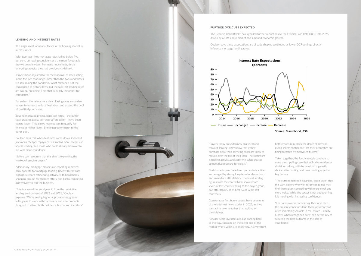 Coulson says these expectations are already shaping sentiment, as lower OCR settings directly influence mortgage lending rates.