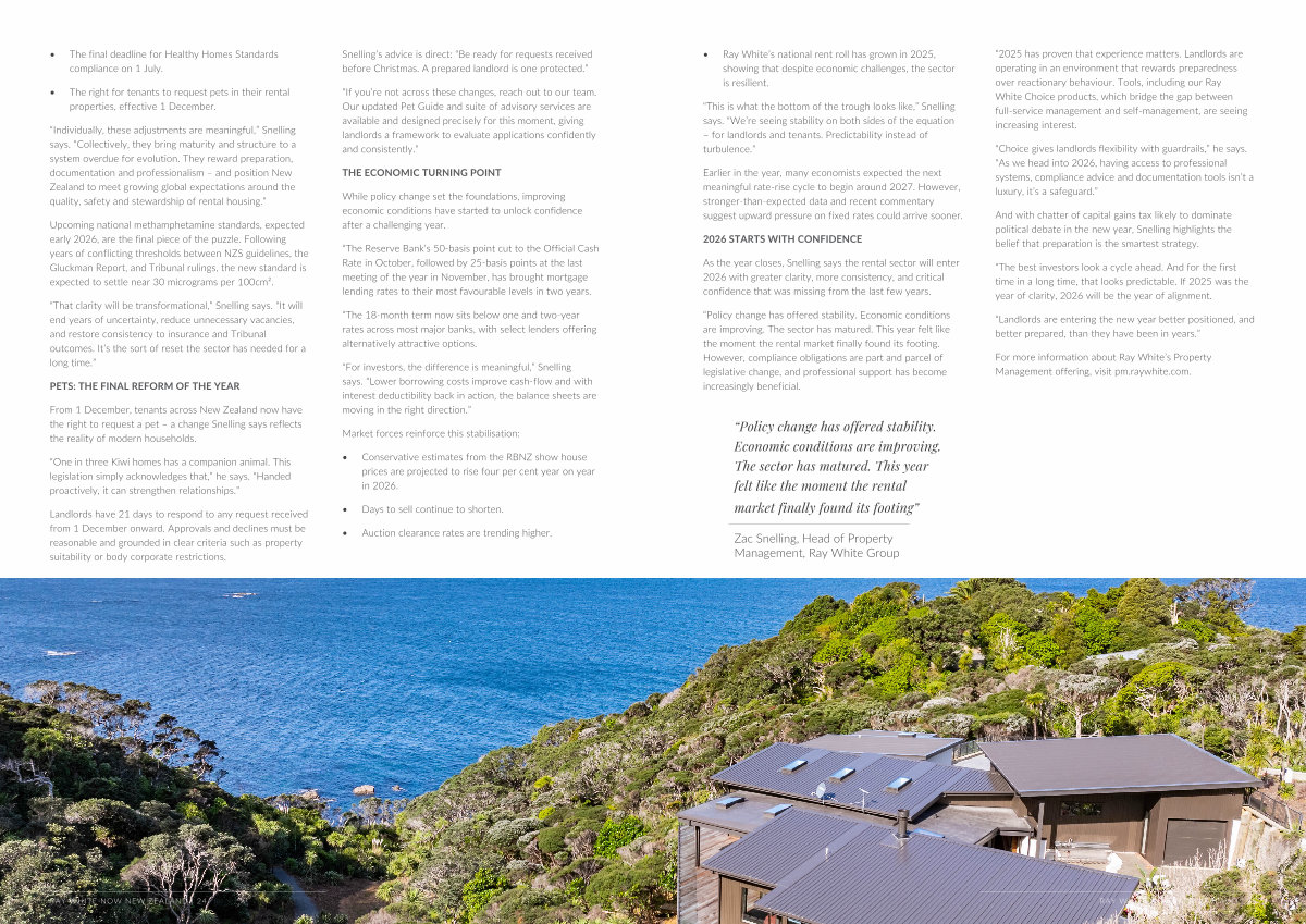 “ 2025 has proven that experience matters. Landlords are operating in an environment that rewards preparedness over reactionary behaviour. Tools, including our Ray White Choice products, which bridge the gap between full-service management and self-management, are seeing increasing interest.