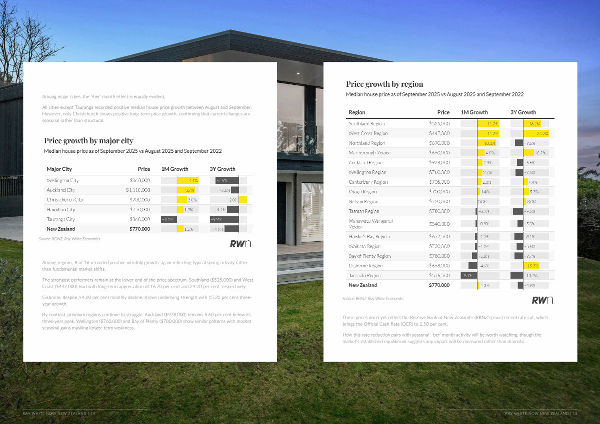 All cities except Tauranga recorded positive median house price growth between August and September. However, only Christchurch shows positive long-term price growth, confirming that current changes are seasonal rather than structural.