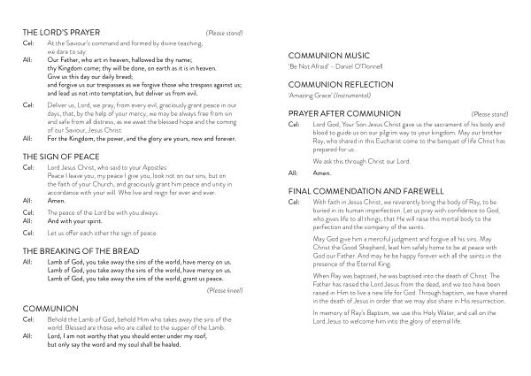 Cel : Lord God , Your Son Jesus Christ gave us the sacrament of his body and blood to guide us on our pilgrim way to your kingdom . May our brother Ray , who shared in this Eucharist come to the banquet of life Christ has prepared for us .