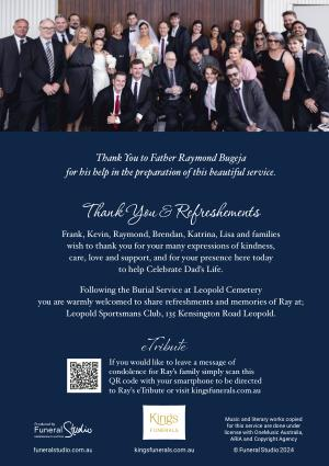 If you would like to leave a message of condolence for Ray ’ s family simply scan this QR code with your smartphone to be directed to Ray ’ s eTribute or visit kingsfunerals . com . au
