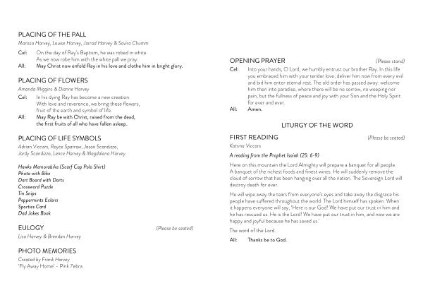 Cel : Into your hands , O Lord , we humbly entrust our brother Ray . In this life you embraced him with your tender love ; deliver him now from every evil and bid him enter eternal rest . The old order has passed away : welcome him then into paradise , where there will be no sorrow , no weeping nor pain , but the fullness of peace and joy with your Son and the Holy Spirit for ever and ever .