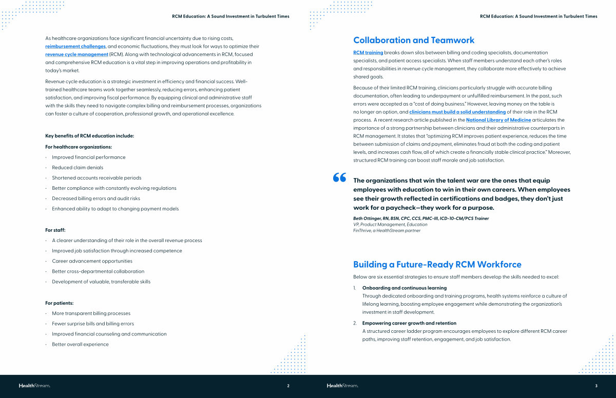 Because of their limited RCM training, clinicians particularly struggle with accurate billing documentation, often leading to underpayment or unfulfilled reimbursement. In the past, such errors were accepted as a“ cost of doing business.” However, leaving money on the table is no longer an option, and clinicians must build a solid understanding of their role in the RCM process. A recent research article published in the National Library of Medicine articulates the importance of a strong partnership between clinicians and their administrative counterparts in RCM management. It states that“ optimizing RCM improves patient experience, reduces the time between submission of claims and payment, eliminates fraud at both the coding and patient levels, and increases cash flow, all of which create a financially stable clinical practice.” Moreover, structured RCM training can boost staff morale and job satisfaction.