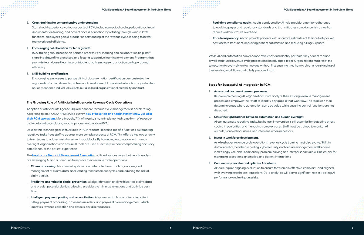 3. Invest in workforce development. As AI reshapes revenue cycle operations, revenue cycle training must also evolve. Skills in data analytics, healthcare coding, cybersecurity, and denials management will become increasingly valuable. Additionally, problem-solving and interpersonal skills will be crucial for managing exceptions, anomalies, and patient interactions.