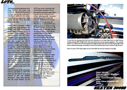 LOTO, we never could get the actual Dyno numbers out of him either, but there was hints thrown around that put it at 1700 - 1800 real HP. If you're wondering what I mean by real, I'm talking about Carson Brummett Horsepower, not "Hot Dyno, Corrected #'s" you get from guys looking to brag to their friends. Carson is a lot like Mercury in the idea that if he tells you it's a 1000 HP, it's going to Dyno a lot higher then that anywhere else, because it will make 1000HP anywhere. The inverse is also true that when you take a 1000 HP from most other places and stick it on his Dyno... Well, you'll end up with that same kind of feeling that everybody got when GPS's came out and their boats no longer ran 100 mph. I did manage to squeak one hard fact out of Vern that he would commit to, and that was "These motors have at least 120 more HP then Romer's setup did when it was set on kill." That would put my personal estimation of HP somewhere near 1950 a side give or take 100. More then 2000 HP, on most Dyno's across the country.