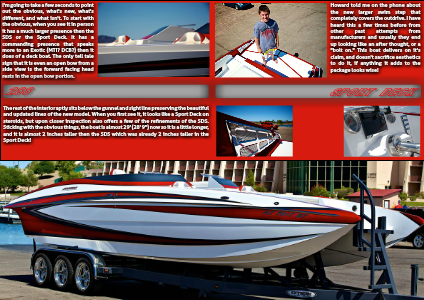 I'm going to take a few seconds to point out the obvious, what's new, what's different, and what isn't. To start with the obvious, when you see it in person it has a much larger presence then the SDS or the Sport Deck. It has a commanding presence that speaks more to an Exotic (MTI? DCB?) then it does of a deck boat. The only tell tale sign that it is even an open bow from a side view is the forward facing head rests in the open bow portion.