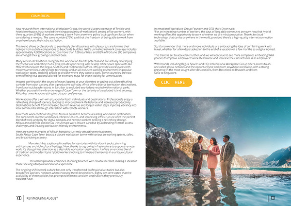 Many African destinations recognise the workcation trend ’ s potential and are actively developing themselves as workcation hubs . This includes partnering with flexible office space specialists like IWG which includes the Regus , SPACES and HQ brands in Africa . IWG provides workspaces with modern amenities , cutting edge technology and an all-inclusive working environment in popular workcation spots , enabling people to choose where they want to work . Some countries are now even offering visa options tailored for extended stays for those looking for a workcation .