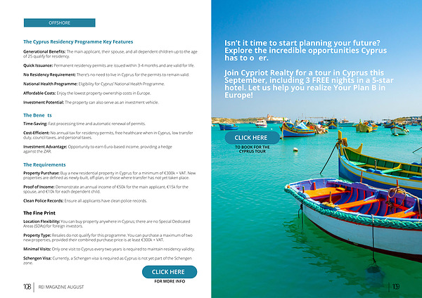Join Cypriot Realty for a tour in Cyprus this September , including 3 FREE nights in a 5-star hotel . Let us help you realize Your Plan B in Europe !
