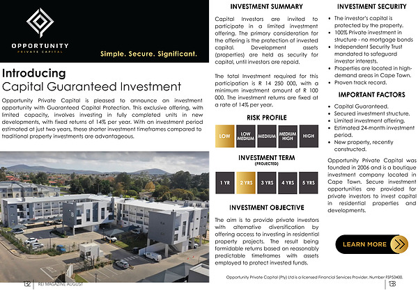 Opportunity Private Capital is pleased to announce an investment opportunity with Guaranteed Capital Protection . This exclusive offering , with limited capacity , involves investing in fully completed units in new developments , with fixed returns of 14 % per year . With an investment period estimated at just two years , these shorter investment timeframes compared to traditional property investments are advantageous .