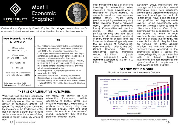 Co-founder of Opportunity Private Capital , Nick Morgan summarises June ’ s economic indicators and takes a look at the rise of alternative investments .