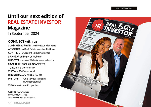 SUBSCRIBE to Real Estate Investor Magazine ADVERTISE on Real Estate Investor Platform CONTRIBUTE Content to REI Platforms SPONSOR an Event or Webinar DISCOVER our new Website www . rei . co . za SIGN-UP for our FREE Newsletters JOIN the REI Community VISIT our 3D Virtual World REGISTER to Attend Our Events