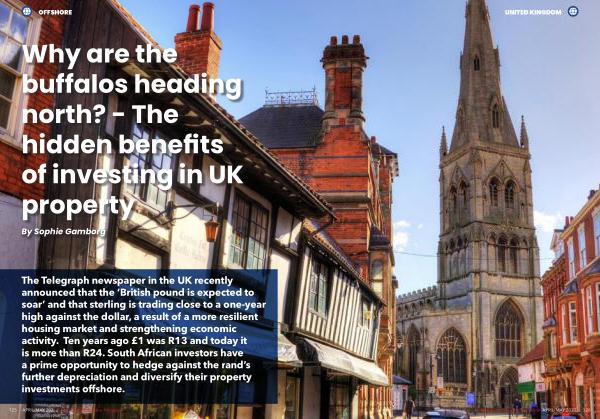 The Telegraph newspaper in the UK recently announced that the ‘ British pound is expected to soar ’ and that sterling is trading close to a one-year high against the dollar , a result of a more resilient housing market and strengthening economic activity . Ten years ago £ 1 was R13 and today it is more than R24 . South African investors have a prime opportunity to hedge against the rand ’ s further depreciation and diversify their property investments offshore .