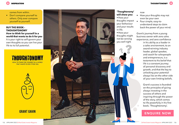 Grant ’ s success is founded on the principles of giving always investing in the success of others and inspiring through the power of the story , which comes to life powerfully in his first book , ‘ Thoughtonomy ’.