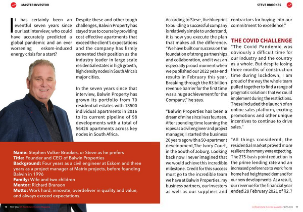 “ Balwin Properties has been a dream of mine since I was fourteen . After spending time learning the ropes as a civil engineer and project manager , I started the business 26 years ago with a 50-apartment development , The Ivory Court , in the South of Joburg . Looking back now I never imagined that we would achieve this incredible milestone . Credit for this success must go to the incredible team we have at Balwin Properties , my business partners , our investors as well as our suppliers and contractors for buying into our commitment to excellence .”