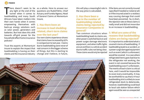 Trust the experts at Momentum Insure to explain the impact that loadshedding is having on their clients and the insurance industry as a whole . Here to answer our questions are Rudolf Britz , Chief Actuary and Funeka Ngewu , Head of General Claims at Momentum Insure .