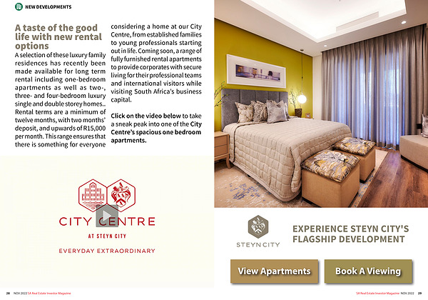 A selection of these luxury family residences has recently been made available for long term rental including one-bedroom apartments as well as two- , three- and four-bedroom luxury single and double storey homes .. Rental terms are a minimum of twelve months , with two months ’ deposit , and upwards of R15,000 per month . This range ensures that there is something for everyone considering a home at our City Centre , from established families to young professionals starting out in life . Coming soon , a range of fully furnished rental apartments to provide corporates with secure living for their professional teams and international visitors while visiting South Africa ’ s business capital .