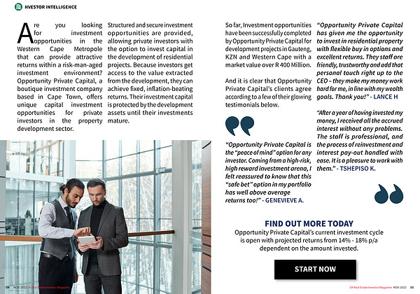 Are you looking for investment opportunities in the Western Cape Metropole that can provide attractive returns within a risk-man-aged investment environment ? Opportunity Private Capital , a boutique investment company based in Cape Town , offers unique capital investment opportunities for private investors in the property development sector .