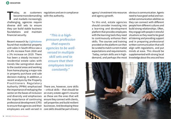 Recent research by Lightstone found that residential property unit sales in South Africa saw a 21.4 % increase from 2020 and a 3 % increase on 2019 . There has been a steady increase in residential estate sales with trends like semigration down to the coastal areas and working from home playing a major role in property purchase and sale decision-making . In addition , a recent analysis by the Property Practitioners Regulatory Authority ( PPRA ) emphasised the importance of reshaping the sector on the bases of inclusion and diversity and emphasises the importance of continuing professional development ( CPD ) to ensure that agencies and their employees are well-versed in regulations and are in compliance with the authority .