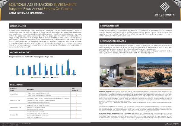 The site of the development is very well located . Langeberg Ridge is a thriving , popular and safe residential area in the Northern Suburbs of Cape Town . The development is surrounded by houses and townhouses in what is an established , traditional area . In addition , the development is in proximity to the Cape Gate regional shopping centre , the Cape Gate Medi-Clinic private hospital and large flagship amenities such as Virgin Active , Builders Warehouse and Makro . For the sporting enthusiasts it is a few short kilometers down the road from the Durbanville Golf Club and Durbanville Sports Complex . Notably , it is within walking distance of a range of amenities . This is an exceptionally desirable residential area and the demand for 2-bedroom units is high , catering to a broad market of owneroccupiers , investors and renters . This remains one of the best performing middle-income residential areas in SA .