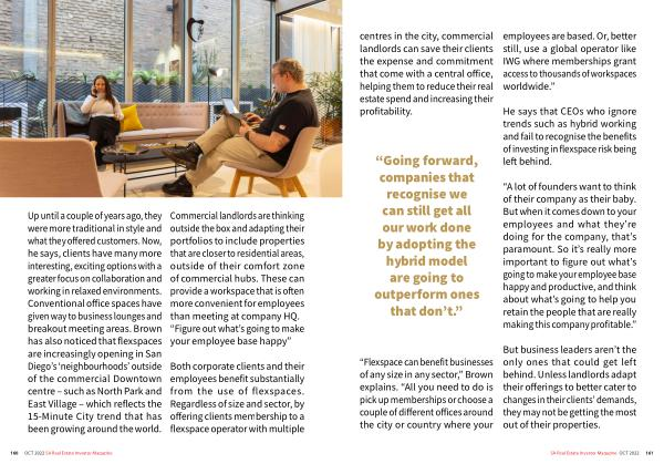 Up until a couple of years ago , they were more traditional in style and what they offered customers . Now , he says , clients have many more interesting , exciting options with a greater focus on collaboration and working in relaxed environments . Conventional office spaces have given way to business lounges and breakout meeting areas . Brown has also noticed that flexspaces are increasingly opening in San Diego ’ s ‘ neighbourhoods ’ outside of the commercial Downtown centre – such as North Park and East Village – which reflects the 15-Minute City trend that has been growing around the world .