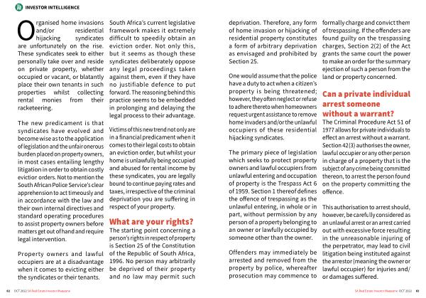 The Criminal Procedure Act 51 of 1977 allows for private individuals to effect an arrest without a warrant . Section 42 ( 3 ) authorises the owner , lawful occupier or any other person in charge of a property that is the subject of any crime being committed thereon , to arrest the person found on the property committing the offence .