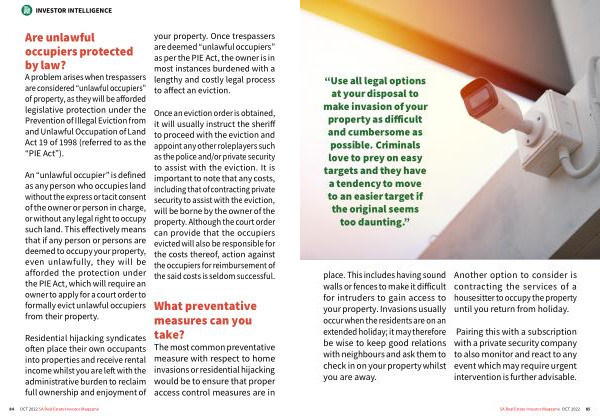 Residential hijacking syndicates often place their own occupants into properties and receive rental income whilst you are left with the administrative burden to reclaim full ownership and enjoyment of your property . Once trespassers are deemed “ unlawful occupiers ” as per the PIE Act , the owner is in most instances burdened with a lengthy and costly legal process to affect an eviction .