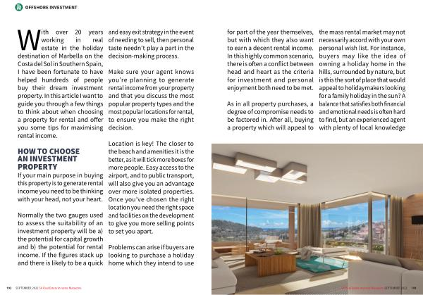 With over 20 years working in real estate in the holiday destination of Marbella on the Costa del Sol in Southern Spain , I have been fortunate to have helped hundreds of people buy their dream investment property . In this article I want to guide you through a few things to think about when choosing a property for rental and offer you some tips for maximising rental income .