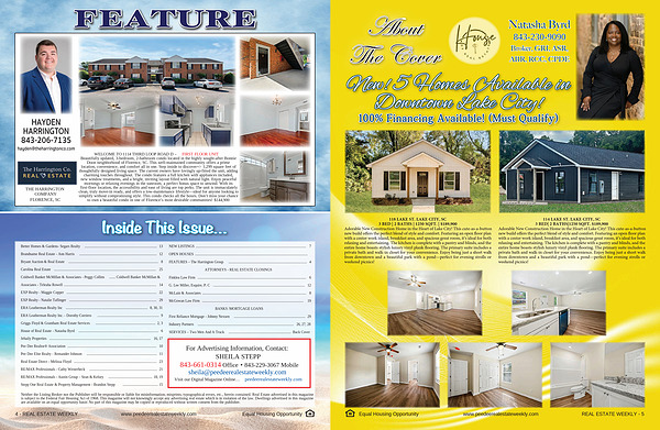 Better Homes & Gardens- Segars Realty................................................................................... 13 Brandname Real Estate- Ann Harris......................................................................................... 12 Bryant Auction & Real Estate....................................................................................................... 8 Carolina Real Estate..................................................................................................................... 25 Coldwell Banker McMillan & Associates- Peggy Collins........ Coldwell Banker McMillan & Associates- Teleaha Rowell.......................................................................................................... 14 EXP Realty- Maggie Copper....................................................................................................... 22 EXP Realty- Natalie Taflinger.................................................................................................... 29 ERA Leatherman Realty Inc.............................................................................................. 8, 30, 31 ERA Leatherman Realty Inc.- Dorothy Corriero....................................................................... 9 Griggs Floyd & Grantham Real Estate Services..................................................................... 2, 3 House of Real Estate- Natasha Byrd............................................................................................ 6 Jebaily Properties.................................................................................................................... 16, 17 Pee Dee Realtor ® Association...................................................................................................... 10 Pee Dee Elite Realty- Remander Johnson................................................................................. 11 Real Estate Direct- Melissa Floyd.............................................................................................. 23 RE / MAX Professionals- Cathy Westerbeck.............................................................................. 21 RE / MAX Professionals- Austin Group – Sean & Kelsey................................................... 18, 19 Stepp One Real Estate & Property Management- Brandon Stepp......................................... 15