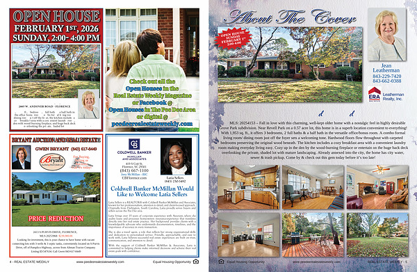 Check out all the Open Houses in the Real Estate Weekly Magazine or Facebook @ Open Houses in The Pee Dee Area or digital @ peedeerealestateweekly. com