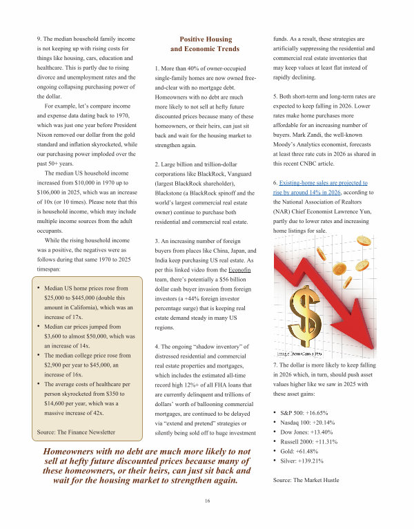 1. More than 40 % of owneroccupied singlefamily homes are now owned freeandclear with no mortgage debt. Homeowners with no debt are much more likely to not sell at hefty future discounted prices because many of these homeowners, or their heirs, can just sit back and wait for the housing market to strengthen again.