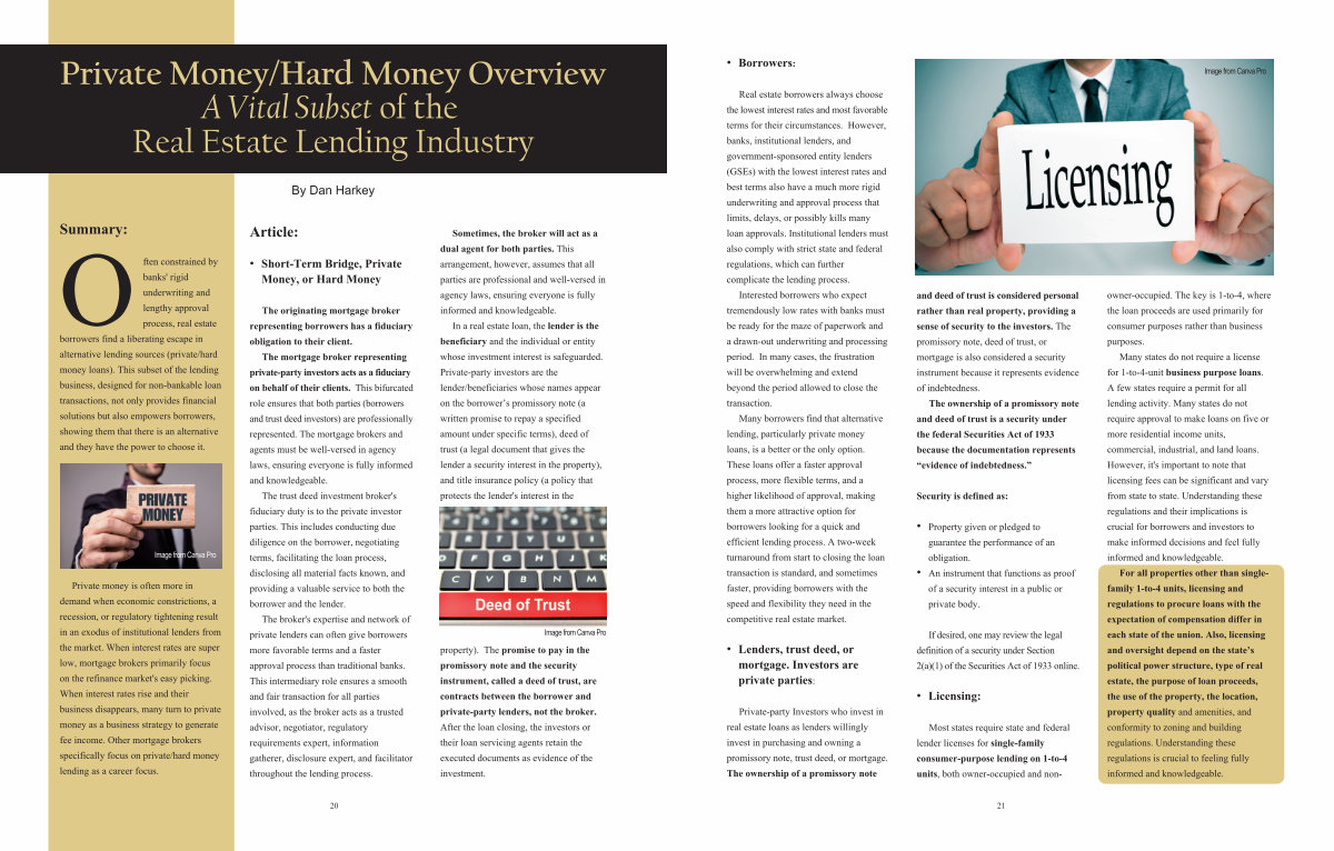Image from Canva Pro property). The promise to pay in the promissory note and the security instrument, called a deed of trust, are contracts between the borrower and privateparty lenders, not the broker. After the loan closing, the investors or their loan servicing agents retain the executed documents as evidence of the investment.