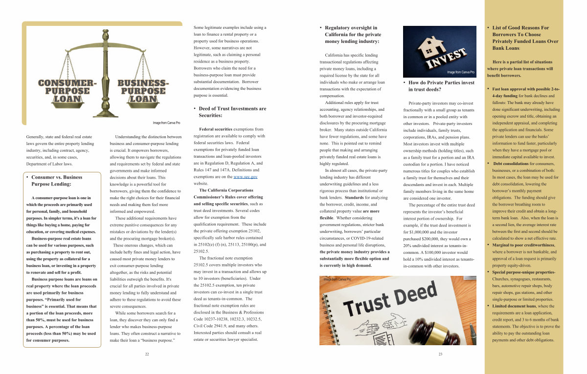 Additional rules apply for trust accounting, agency relationships, and both borrower and investorrequired disclosures by the procuring mortgage broker. Many states outside California have fewer regulations, and some have none. This is pointed out to remind people that making and arranging privately funded real estate loans is highly regulated.