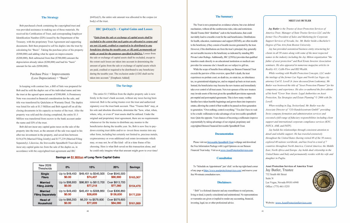 Bob did not incur any capital gains taxes on the sale of the property into the trust, as the amount of the sale was equal to his aftertax investment in the property, and saved him between $ 154,478( Married Filing Jointly) and $ 177,239( Married Filing Separately). Likewise, the Irrevocable Spendthrift Trust did not incur any capital gains tax from the sale of the duplex as, in accordance with the copyrighted trust agreement and IRC