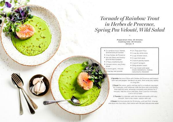 Tornade of Rainbow Trout in Herbes de Provence , Spring Pea Velouté , Wild Salad
