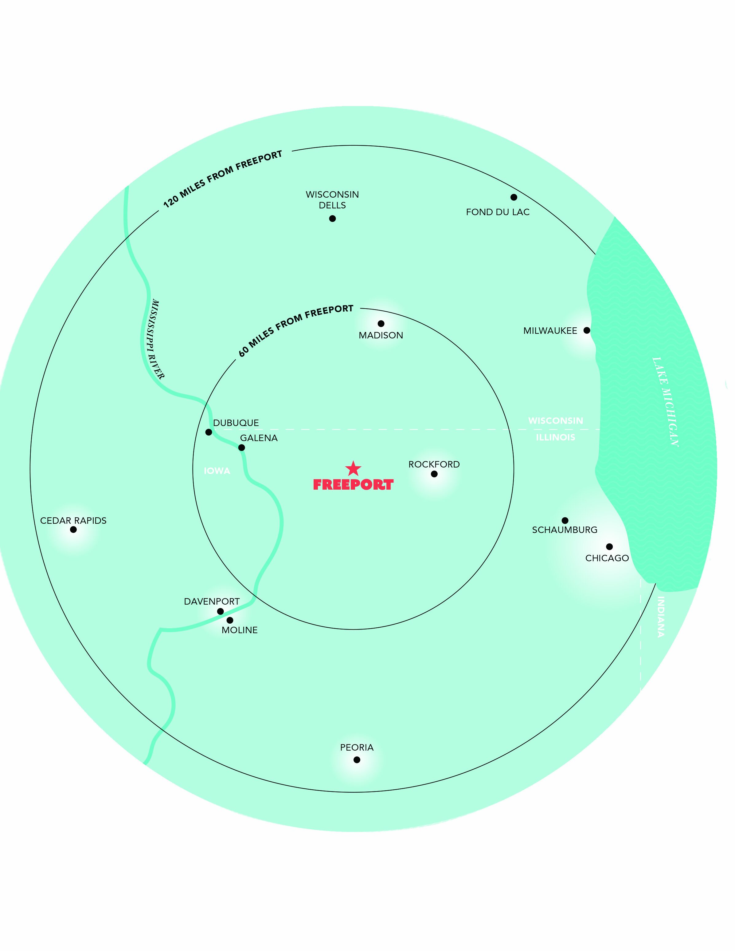 Conveniently situated in Nortwestern Illinois, Freeport is 25 miles west of Rockford, 20 minutes south of Monroe, WI, and easily accessible to major metro areas in every direction including Dubuque, Madison, Milwaukee and Chicago all within 100 miles.