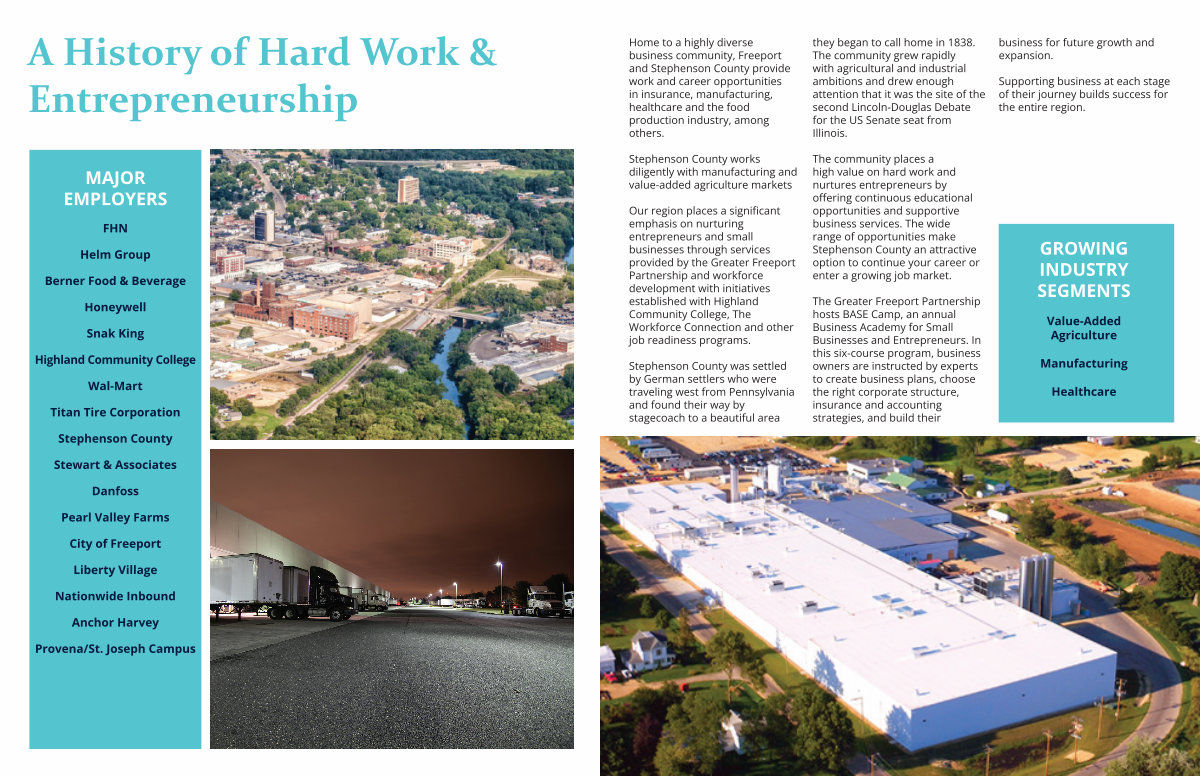 Our region places a significant emphasis on nurturing entrepreneurs and small businesses through services provided by the Greater Freeport Partnership and workforce development with initiatives established with Highland Community College, The Workforce Connection and other job readiness programs.