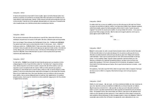 Vi Santos ofuscando( ou encarando?) Carla no pátio. Agora na minha fantasia sobre meu cérebro na parede, se transformou no cérebro dele. Meu nervosismo se transformou em malevolência, todas destinadas a Santos. O filho da puta sortudo está recebendo muito da minha atenção. Transformei minha agitação desesperadora em raiva pura. Provavelmente não é saudável para mim. Definitivamente não é saudável para Santos.