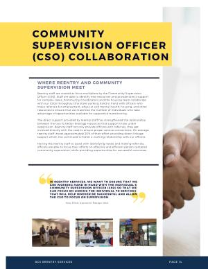Reentry staff are viewed as force multipliers by the Community Supervision Officer ( CSO ). Staff are able to identify new resources and provide direct support for complex cases . Community Coordinators and the housing team collaborate with our CSOs throughout the state working hand in hand with officers who make referrals for employment , physical and mental health , housing , and other resources to ensure that we maximize the number of individuals who take advantage of opportunities available for supportive transitioning .