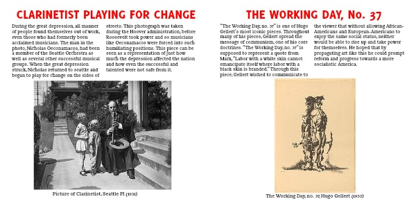“The Working Day, no. 37” is one of Hugo Gellert’s most iconic pieces. Throughout many of his pieces, Gellert spread the message of communism, one of his core doctrines. “The Working Day, no. 37” is supposed to represent a quote from Marx, “Labor with a white skin cannot emancipate itself where labor with a black skin is branded.” Through this piece, Gellert wished to communicate to the viewer that without allowing African-Americans and European-Americans to enjoy the same social status, neither would be able to rise up and take power for themselves. He hoped that by propagating art like this he could prompt reform and progress towards a more socialistic America.