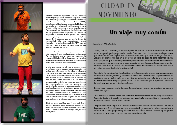 Lunes, 7:20 de la mañana, es normal que la parada del camión se encuentre llena de personas que al igual que yo inician su día. Pasan uno, dos y tres, derramando personas que se sostienen con la punta de los dedos en el tubo que sirve de apoyo para subir. Es hasta el cuarto autobús en el que veo un poco de espacio para nosotros; en un principio pensé que todas las personas que estábamos esperando nunca entraríamos en esa unidad, pero para mi sorpresa a empujones y codazos nos logramos acomodar y con el codo de un oficinista sobre mi cara y la axila de un obrero en mi hombro, inicia mi viaje sobre ruedas hacia la universidad.