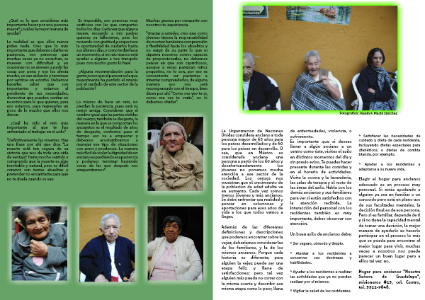 La Organización de Naciones Unidas considera anciano a toda persona mayor de 65 años para los países desarrollados y de 60 para los países en desarrollo. O sea, que en México es considerada anciana una persona a partir de los 60 años y desafortunadamente los jóvenes no ponemos mucha atención a ese sector de la sociedad. Los censos nos muestran que el crecimiento de la población de edad adulta va en aumento. Cada vez somos menos jóvenes y más ancianos. Se debe enfrentar esa realidad y pensar en soluciones y aportaciones para esos años de vida a los que todos vamos a llegar.