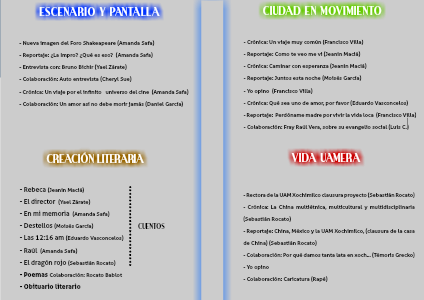 La revista “Reflejo” es un proyecto creado por alumnos de la carrera de Comunicación Social de la UAM Xochimilco. El contenido es una recopilación de artículos y escritos que reflejan los intereses de cada uno de los participantes de esta revista. Las distintas formas de pensar por parte de los escritores denotan un reflejo de la sociedad en la que vivimos. Le damos una importancia particular a la cultura de la que goza el Distrito Federal, ya que consideramos que es rica y amplia, al ofrecernos un abanico de posibilidades culturales, desde una buena obra de teatro hasta un grafitti en la pared.