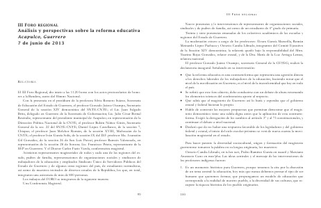 Nueve ponencias y/o intervenciones de representantes de organizaciones sociales, sindicales y de padres de familia, así como de un estudiante de 4º grado de primaria. Treinta y siete ponencias emanadas de los colectivos académicos de las escuelas y regiones del Estado de Guerrero. La moderación estuvo a cargo de los profesores: Álvaro García Maravilla, Román Meinardo López Pachuca y Octavio Candia Librado, integrantes del Comité Ejecutivo de la Sección XIV democrática; la relatoría quedó bajo la responsabilidad del Mtro. Taurino Rojas González, relator estatal, y de la Dra. María de la Luz Arriaga Lemus, relatora nacional. El profesor Gonzalo Juárez Ocampo, secretario General de la CETEG, realizó la declaratoria inaugural. Señalando en su intervención: • Que la reforma educativa es una contrarreforma que representa una agresión directa a los derechos laborales de los trabajadores de la educación, haciendo notar que el nivel de la movilización en Guerrero, es el nivel de la inconformidad que hay en todo el país. • Se refirió que este foro abierto, debe conducirse con un debate de altura retomando los elementos teóricos del conferencista aporte al respecto. • Que sabía que el magisterio de Guerrero así lo haría y esperaba que el gobierno estatal y federal hicieran lo propio. • Habló de construir las mejores propuestas que permitan demostrar que el magisterio democrático tiene una salida digna antes que la aplicación de esta contrarreforma. Exigió la derogación de los cambios al artículo 3º y al 73 constitucionales, y continuar el debate a nivel nacional. • Declaró que de no haber una respuesta favorable de los legisladores y del gobierno federal y estatal, el inicio del ciclo escolar próximo se verá de nueva cuenta la movilización magisterial en el estado. Para hacer patente la diversidad sociocultural, origen y formación del magisterio guerrerense tomaron la palabra en su lengua originaria, los maestros: Octavio Candia Librado, en tu’un savi, Pedro Ramírez García en nauatl y Marciano Anastasio Cano en mee’pha. Las ideas centrales y el mensaje de las intervenciones de los profesores indígenas fueron: 1. Es un momento histórico para Guerrero, porque tenemos la cita por la discusión de un tema central: la educación, hoy más que nunca debemos pensar el tipo de ser humano que queremos formar, que propongamos un modelo de educación que corresponda a la realidad de nuestro pueblo, a la diversidad de sus culturas, que recupere la riqueza histórica de los pueblo originarios. 100