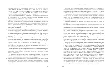 jo. Por eso TODOS LOS PARTICIPANTES EXIGEN LA DEROGACIÓN DE LOS CAMBIOS AL TERCERO CONSTITUCIONAL Y AL 73, EL FORO SE PRONUNCIA PORQUE EL GOBIERNO FEDERAL Y EL CONGRESO DE LA UNIÓN DEROGUEN LOS CAMBIOS REALIZADOS. QUE LOS DIPUTADOS Y SENADORES PRESENTEN LA INICIATIVA. ? Se exige que los diferentes niveles de gobierno y los diputados y senadores respeten la voluntad popular y el evidente rechazo a una reforma gerencial de la educación. Procediendo a la derogación de los cambios. 3.- El gobierno de EPN declara que la reforma ya no tiene marcha atrás, pero están en curso miles de demandas de amparo y ya existe una decisión judicial que otorga la suspensión definitiva de la aplicación del último párrafo del cambio al tercero constitucional, que tienen que ver con la estabilidad en el empleo (ingreso, promoción y permanencia), por eso se propone exigir a la Suprema Corte que declare la inconstitucionalidad de la reforma. 4.- Esta reforma y todas las que está impulsando el gobierno actual, a través del pacto por México, obe decen a los intereses empresariales y a los organismos Internacionales como la OCDE, este organismo que es el encargado de imponer las pruebas estandarizadas como el proyecto pedagógico del país y sirve como el principal instrumento para el ataque a los maestros, responsabilizándolos de los problemas educativos. 5.- Se identifica la necesidad de elaborar una verdadera Reforma educativa integral, humanista, transformadora, que recupere lo colectivo y la solidaridad como valores fundamentales, se propone tomar como base el documento de la CNTE “HACIA LA EDUCACIÓN QUE NECESITAMOS LOS MEXICANOS” ? Se proponen características de una nueva curricula, con reivindicación de los saberes socialmente significativos, que desarrolle las capacidades de pensamiento crítico y de indagación de los niños y jóvenes. ? Los asistentes al FORO se pronuncian por el respeto a la educación pública, laica y gratuita. Que el Estado garantice la educación como un derecho humano. Se reitera que debe ser una educación humanista, de valores universales, visión amplia de ciencias y humanidades. ? Se propone reorientar todo el proceso educativo, fomentando la participación activa de todos los sujetos educativos, estudiantes, padres de familia, maestros, comunidad, para una verdadera transformación social pedagógica. 6.- Se rechaza la evaluación estandarizada, ahistórica, homogeneizante, que no respeta la multiculturalidad de nuestro país, ni recupera la riqueza cultural e histórica de nuestros pueblos originarios. Se exige la eliminación de la prueba ENLACE y la prueba PISA. 105
