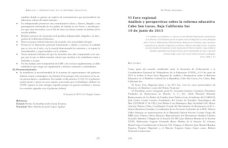 Como parte del acuerdo establecido entre la Secretaría de Gobernación y la Coordinadora Nacional de Trabajadores de la Educación (CNTE), el 19 de junio de 2013 se realizó el Sexto Foro Regional de Análisis y Perspectivas sobre la Reforma Educativa en el Pabellón Cultural de la República, Cabo San Lucas, Los Cabos, Baja California Sur. El Sexto Foro Regional inició a las 8:55 hrs., con los actos protocolarios de Honores a la Bandera y canto del Himno Nacional. El Presídium estuvo integrado porel Sr. Leonardo Jiménez Castrejón, Presidente Fundador de Democracia en Marcha, A. C.; Sra. Adela Pimentel Miranda, Representante de los Padres de Familia; Jesús Pedraza Lara, Estudiante del COBACH; Juan Carlos Cortés Lozano, Estudiantes del Centro de Estudios Tecnológicos del Mar (CETMAR 37 de CSL); José Rubén Cota Manríquez, Rep. Sociedad Civil; Marco Antonio Pacheco Peña, Coordinador Estatal del Movimiento de Resistencia en B. C.; Simón Mendoza González, Coordinador de los Servicios Culturales de la SEP; Alberto Téllez Sahuque en representación de la Diputada Federal Socorro Ceseña Chapa del PRD; José Urbano Ochoa Romero, Representante del Movimiento Sindical Cabeño; Gonzalo Martínez Villagrán de la Sección IX DF; Juan Melchor Román de la Sección XVIII, Michoacán; Augusto Fernando Reyes Medina de la Sección 22, Oaxaca; Daniel López Castellanosde la Sección VII, Chiapas; el Maestro Juan Manuel Rendón Esparza, Ponente Magistral; y, el Maestro Eugenio López López como, Relator Nacional coadyuvante. 128